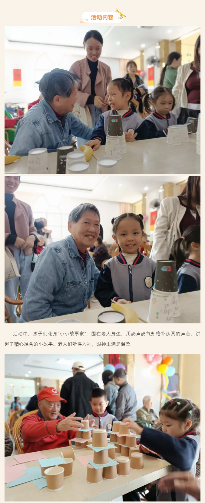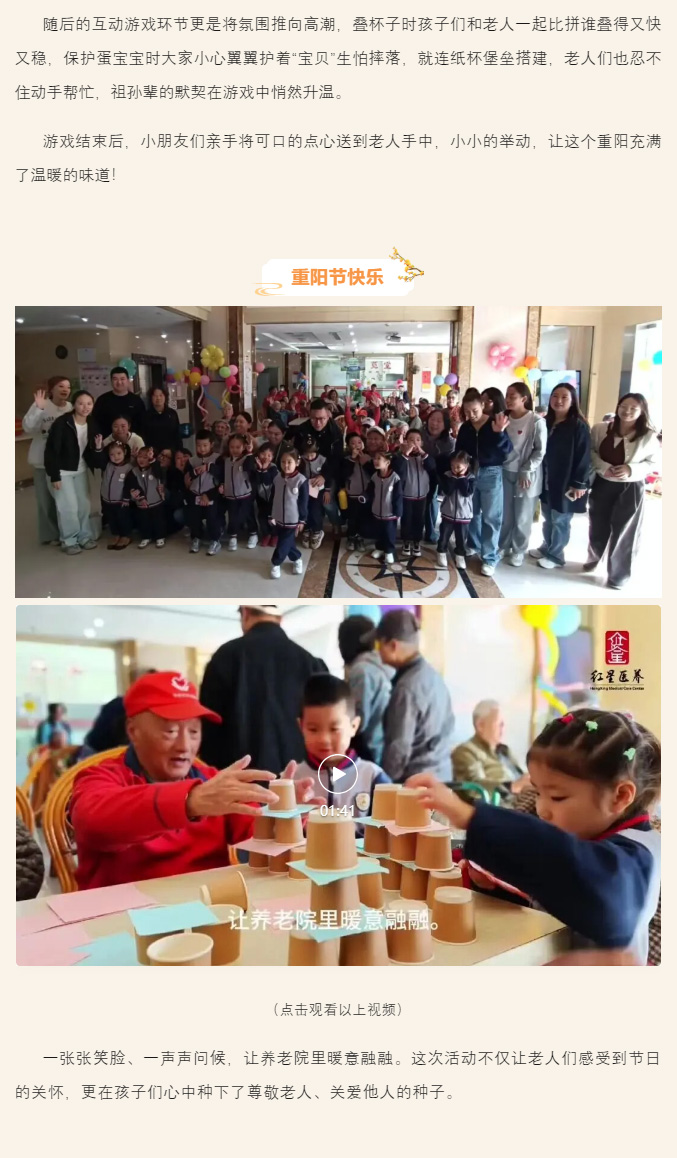简介:九九重阳,情意绵长。在这个充满温情的传统节日里,高境三幼的小朋友们带着满满的爱意,走进高境镇养老院,与爷爷奶奶们共度美好时光。