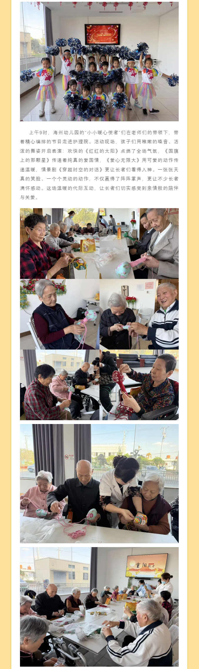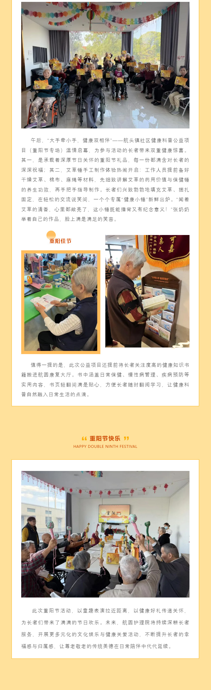 简介:岁岁重阳,今又重阳。为弘扬中华民族尊老敬老的传统美德,营造温馨和谐的节日氛围,10月28日航圆护理院以“敬老、健康”为核心,开展了系列重阳活动,为院内长者送上了一份满怀
