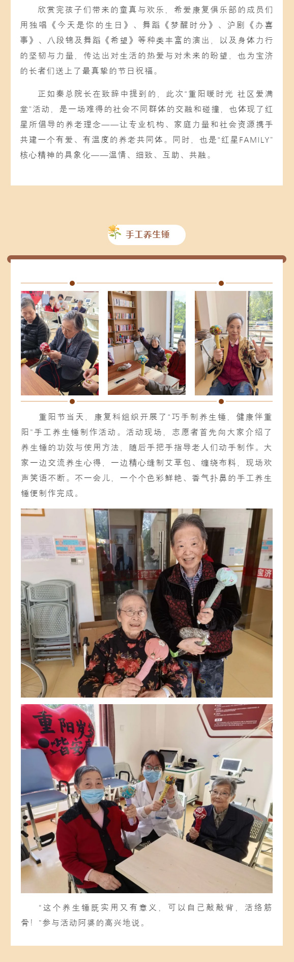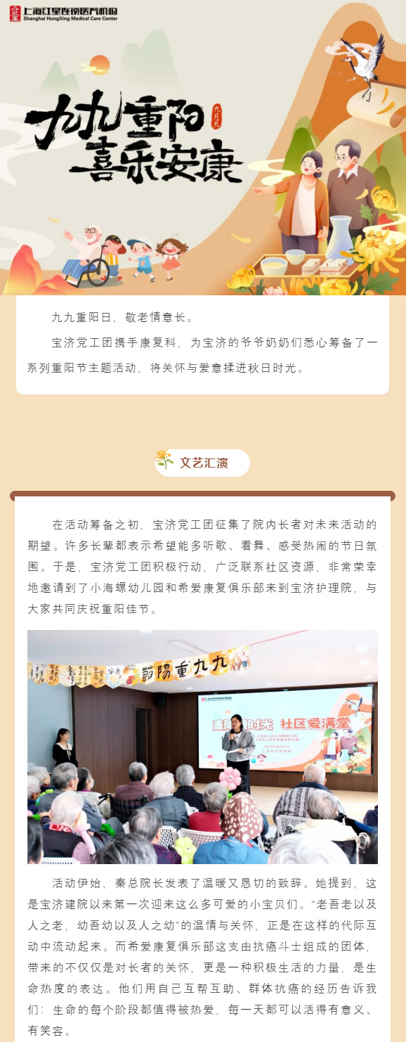 简介:九九重阳日,敬老情意长。 宝济党工团携手康复科,为宝济的爷爷奶奶们悉心筹备了一系列重阳节主题活动,将关怀与爱意揉进秋日时光。