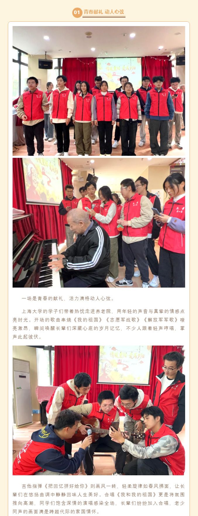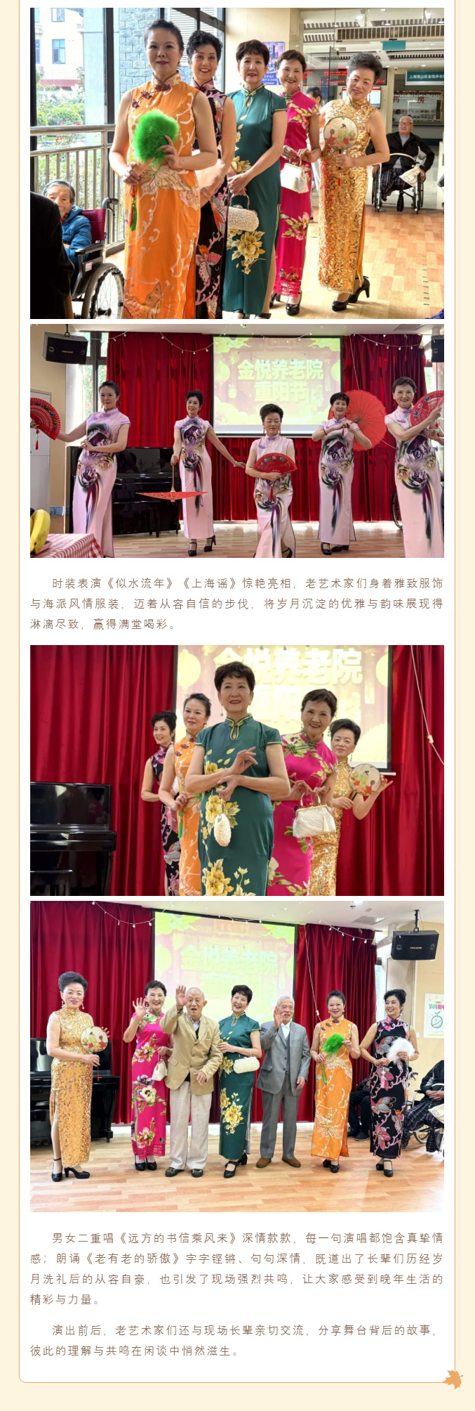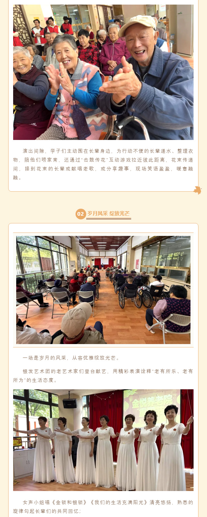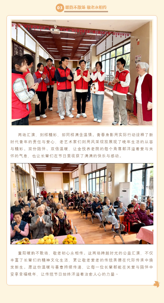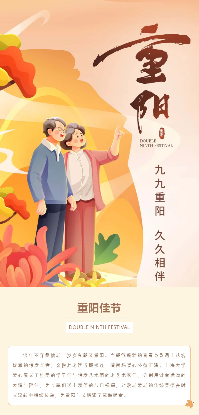 简介:流年不弃桑榆老,岁岁今朝又重阳。当朝气蓬勃的青春身影遇上从容优雅的银发长者,金悦养老院近期接连上演两场暖心公益汇演。上海大学爱心屋义工社团的学子们与银发艺术团的老